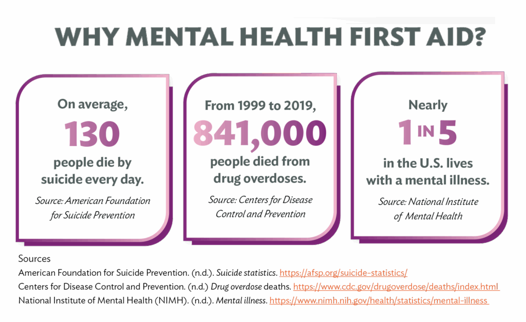 Many people know to call 911 or administer CPR for a physical health emergency but hesitate to start conversations about mental health and substance use. MHFA provides the tools a layperson needs to take action.